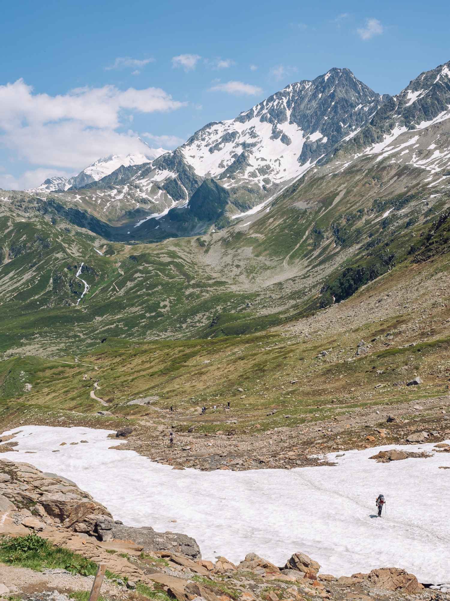 Een van de mooiste overgangen van de hele route. Via de Grand Col Ferret trek je van Italië naar Zwitserland. Beneden liggen de terrassen van Courmayeur, een Italiaans alpendorp dat zo uit een film lijkt te komen. Daarboven wachten stille hoogvlaktes, gevolgd door een lange afdaling langs een beek richting je eerste Zwitserse bergdorp. Twee landen, één dag.